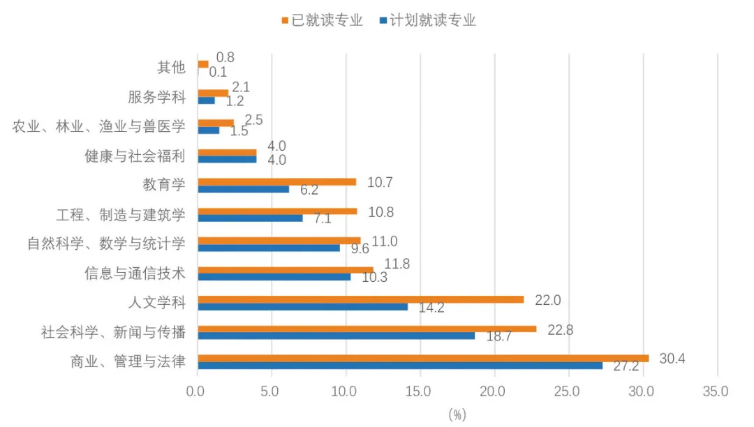 从计划出国和已出国留学的数据对比来看,留学人员实际所学专业在排名上没有变化,除了健康与社会福利专业,其他专业占比都有一定幅度的增加,这与部分学生在完成某个阶段学习后选择在本专业或跨专业领域继续深造有一定联系。此外,选择与人工智能相关的计算机、数学、物理等专业的留学人员占比持续上升。
