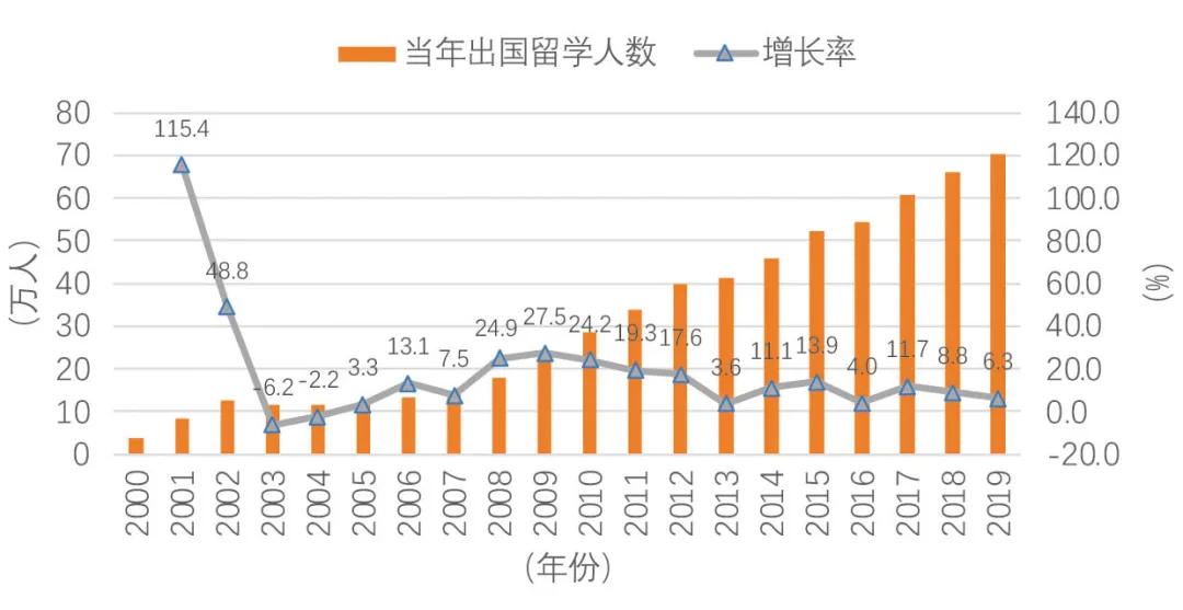根据教育部数据,从2000年到2019年,中国出国留学人数快速增长,除2003年和2004年外,年度出国留学人数均为正增长。中国学生出国留学发展的趋势与中国参与全球化进程的总体趋势基本相同。