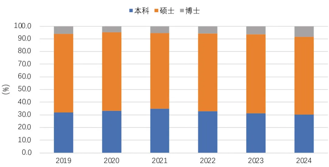 在留学层次方面,根据教育部留学服务中心国(境)外学历学位认证数据库,2019年-2024年,申请学历学位认证的留学人员中,