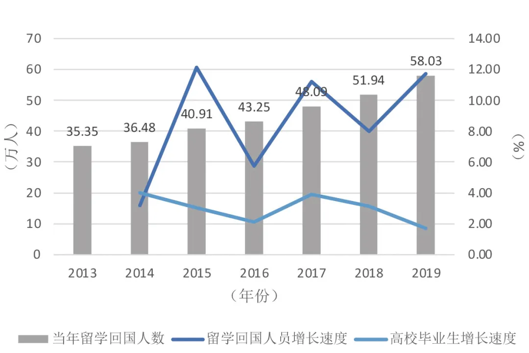 据教育部年度出国留学人员情况统计,2015年-2019年,留学回国人员数量保持10%左右的增速,超过了国内高校毕业生增长速度,就业市场中留学回国人员数量快速增长,留学回国人员在当年新进入就业市场的人员中占比不断提高。