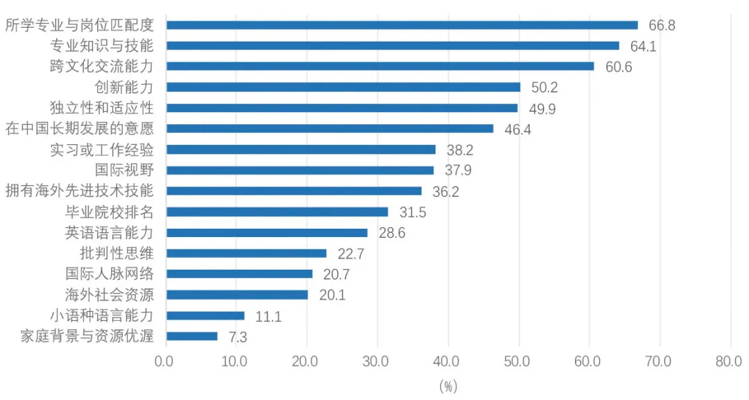 △图9:雇主看重留学人员的相关因素(资料来源:教育部留学服务中心、全球化智库[CCG],《中国出国留学蓝皮书2025》国内雇主专题问卷)